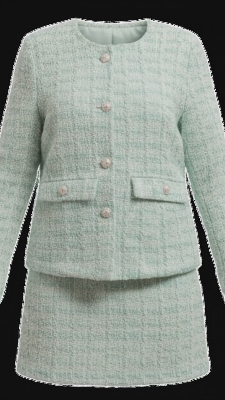 La pieza superior es una declaración de intenciones. Diseñada con un corte de manga larga depurado y un cuello redondo impecable, esta chaqueta enmarca el rostro con una delicadeza sublime. El punto focal reside en su abotonadura: una hilera de botones aperlados de gran calibre que recorren el frente. Estos no son simples cierres, sino verdaderas piezas de joyería que capturan la luz y aportan un contraste nacarado sobre la textura de la tela, eliminando la necesidad de collares adicionales y elevando instantáneamente la categoría de tu imagen.