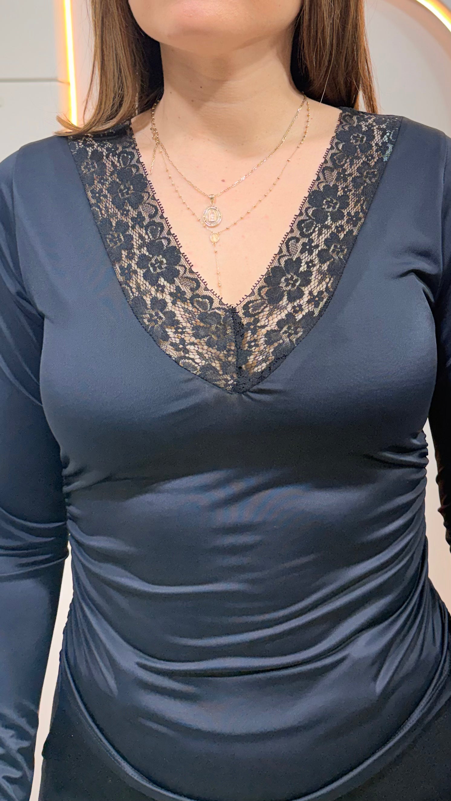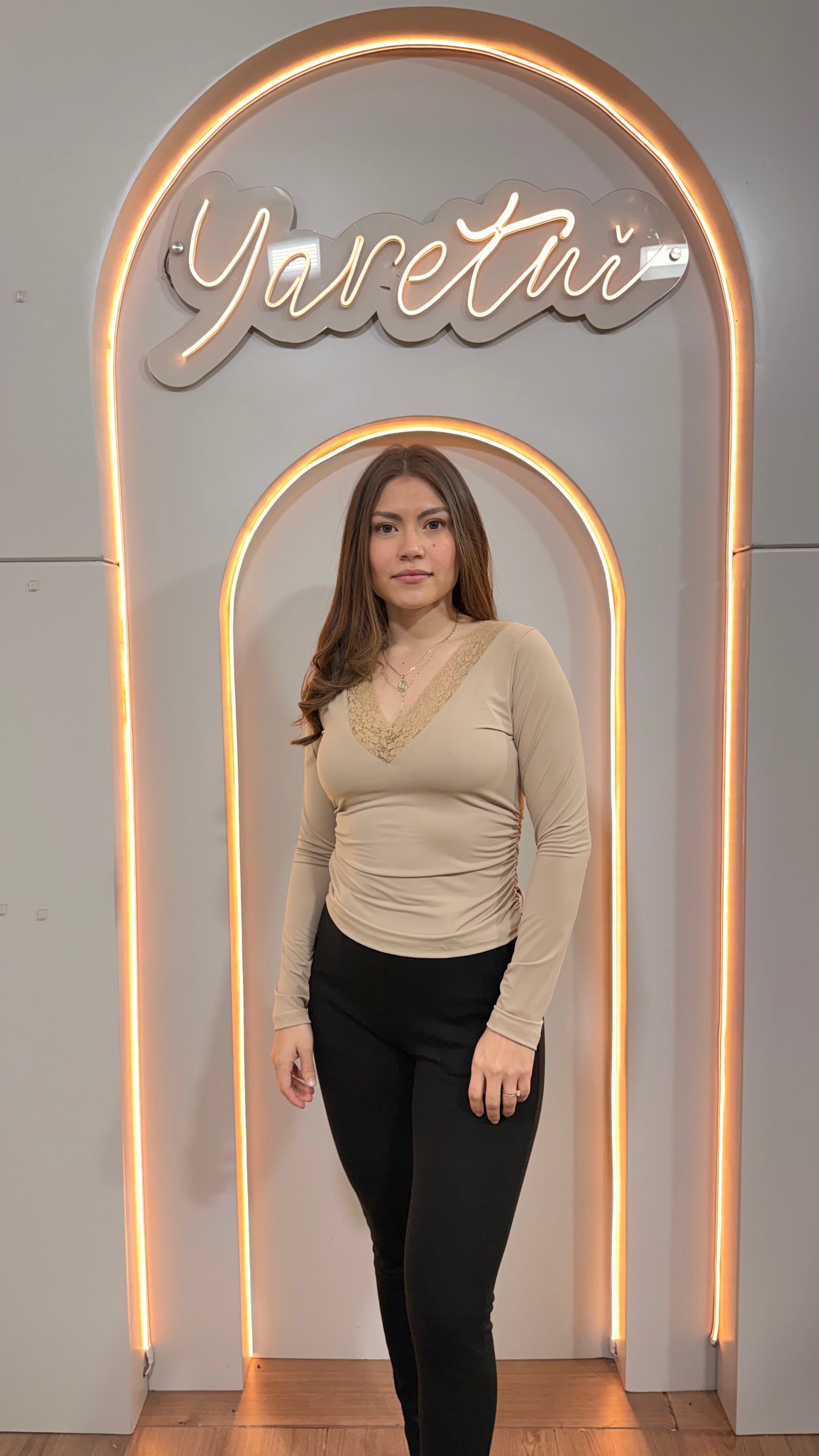 El protagonismo se lo lleva su escote: un favorecedor cuello en V que alarga visualmente el cuello, adornado con una delicada aplicación de encaje alrededor. Este sutil detalle lencero añade un aire romántico, sensual y elegante, elevando la blusa de un básico a una prenda llena de personalidad.
