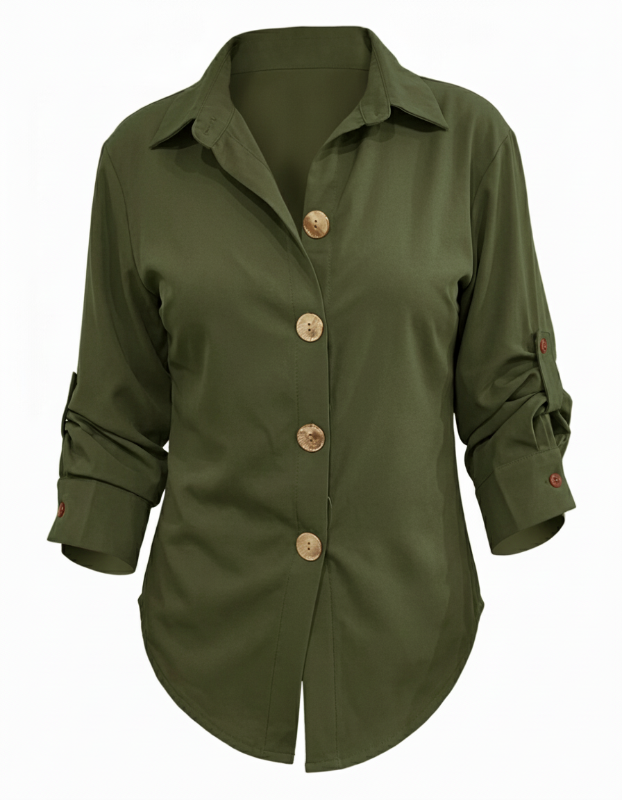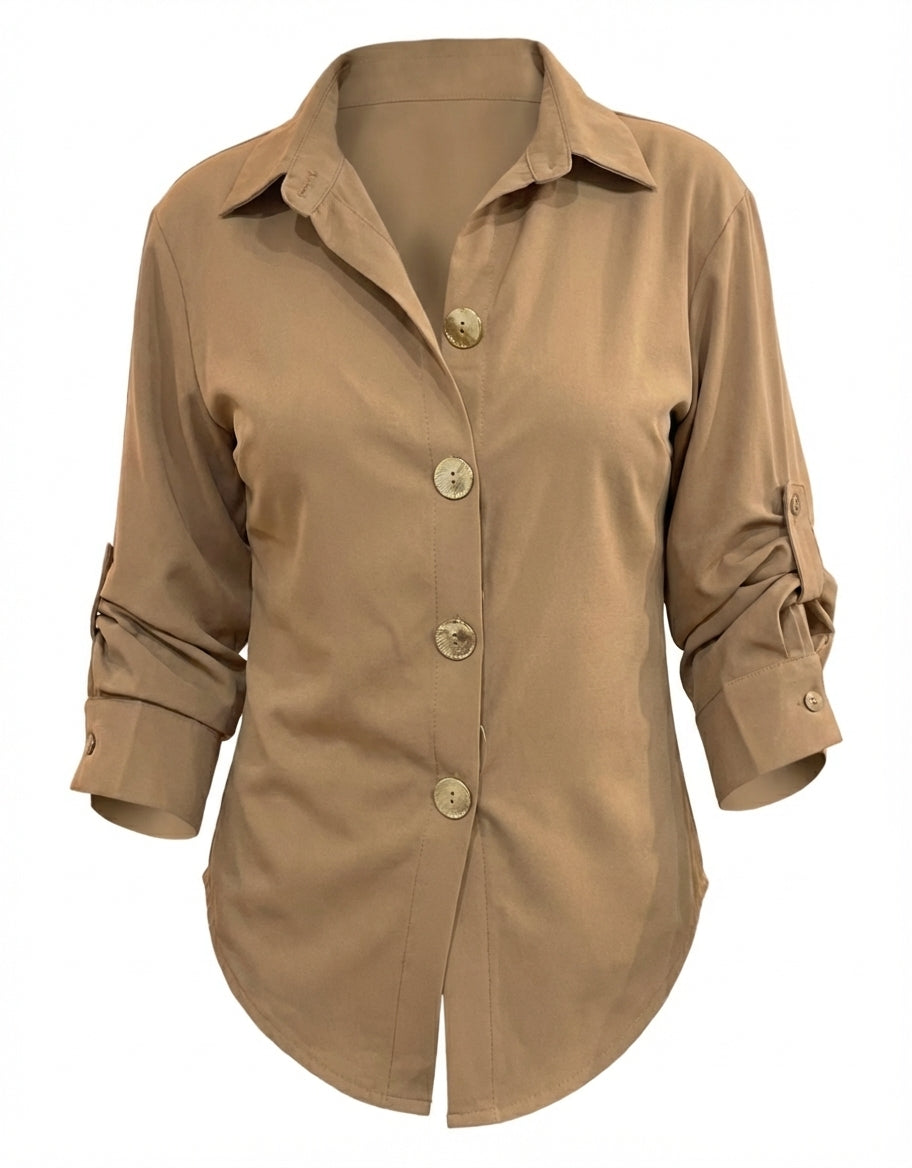 Lo que convierte a esta camisa en una pieza única son sus botones dorados de tamaño mediogrande. Lejos de ser un simple cierre, funcionan como verdaderos accesorios que aportan luz y un aire de lujo inmediato a tu outfit. Este contraste dorado transforma un diseño clásico en una declaración de moda sofisticada.