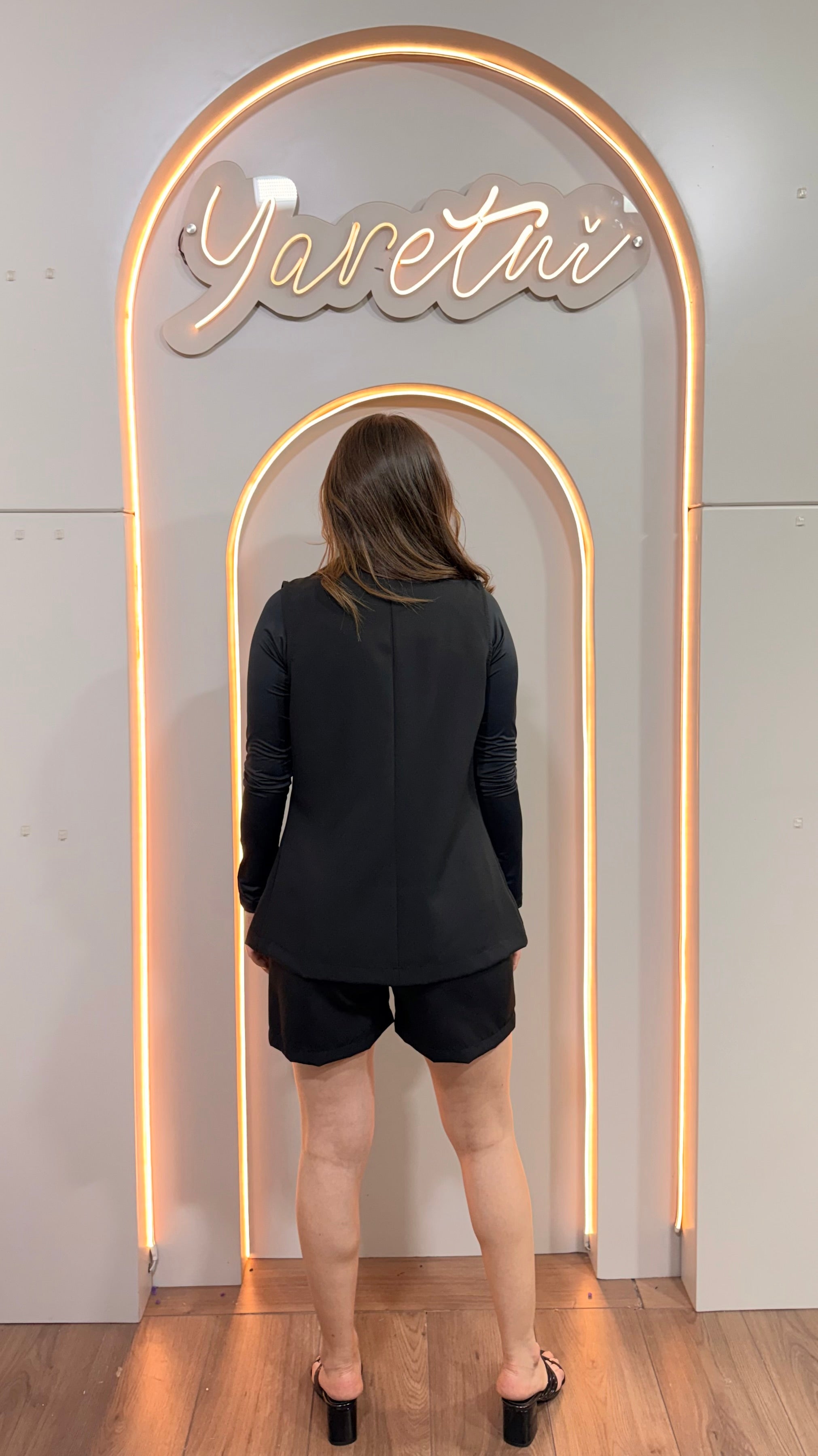 Chaleco tipo blazer sin mangas con solapa elegante y corte ligeramente largo que estiliza la silueta.